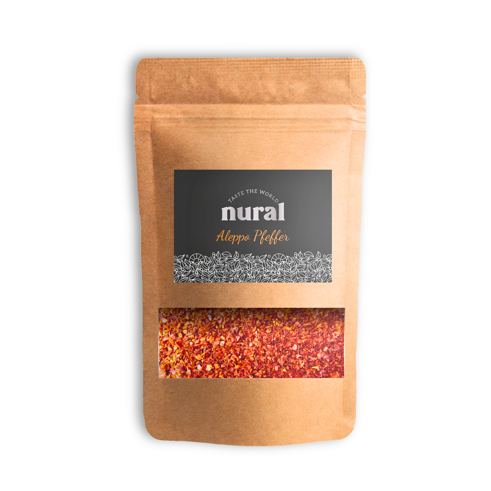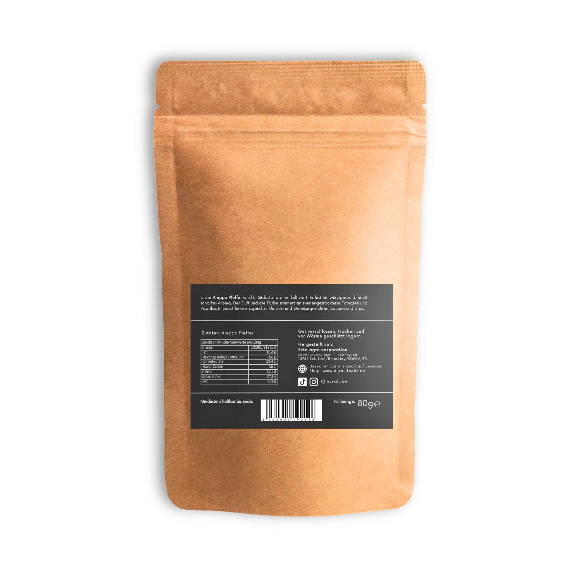 Erleben Sie unvergleichliche Qualität mit unserem Aleppo Pfeffer. Durch eine kurze Lieferkette und sofortige Verarbeitung verpacken wir Gewürze aromaversiegelt, was Farbe und Duft bewahrt. Unsere schonende Verarbeitung garantiert Spitzenqualität. Der Aleppo Pfeffer bringt angenehme Schärfe, fruchtige und rauchige Noten in Ihre Gerichte. Perfekt für türkische und orientalische Küche. Unsere nachhaltigen Craft Bags sind ideale Refill-Optionen für unsere wiederverwendbaren Glastiegel in unseren Sets. Genießen Sie 100% naturreine Rohkost-Qualität ohne Zusatzstoffe, Salze, Aromen oder Konservierungsmittel. -